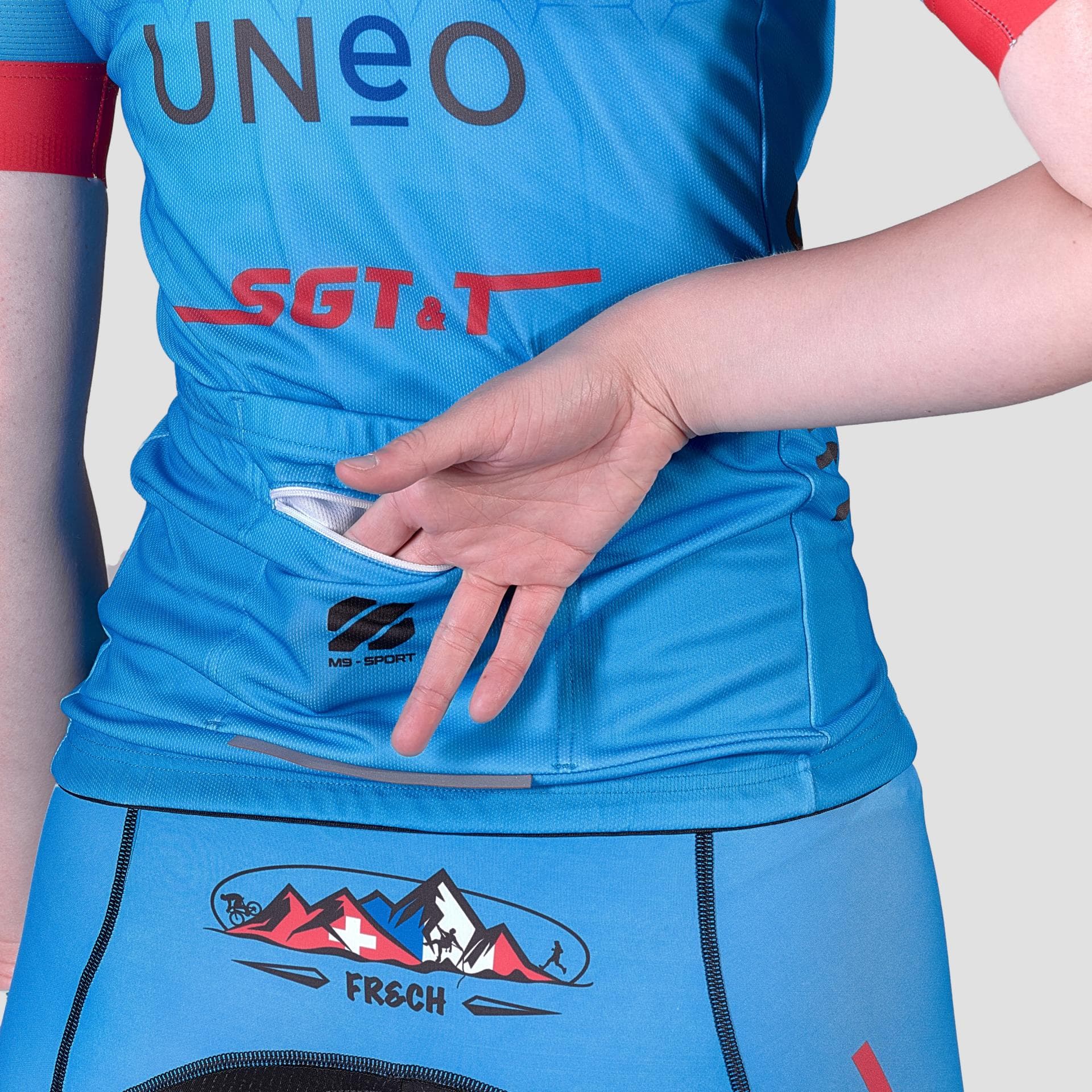 3 tasche posteriori più taschino con zip di servizio